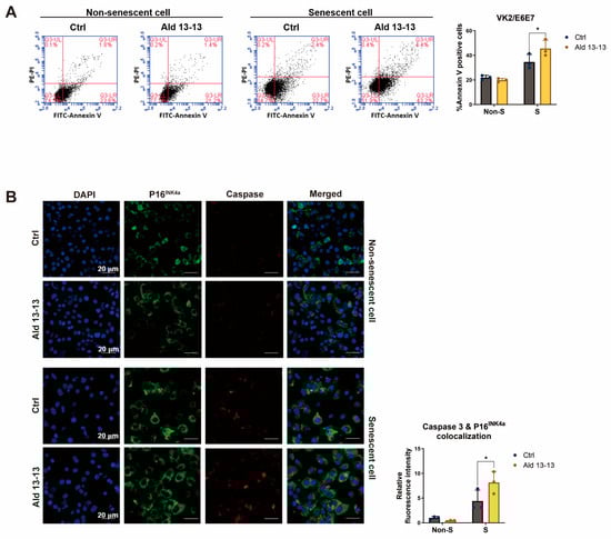 Aldehyde 13-13 showcases senolytic properties in senescent VK2 cells: (A) Cell sorting evaluation of Annexin V in both non-senescent (non-S) and senescent (S) cells; (B) Immunocytochemical study of P16INK4a (green) and caspase-3 (red) in both non-senescent (non-S) and senescent (S) cells. Ctrl stands for control (0.1% DMSO); Ald 13-13 is aldehyde 13-13 (40 µM). Data are represented as mean ± SD. Two-tailed unpaired t-test was utilized for multiple or two-group comparisons. * p < 0.05.