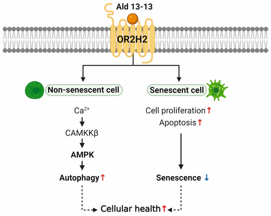 Proposed model diagram. In non-senescent cells, aldehyde 13-13 activates OR2H2, enhancing autophagy through AMPK activation. Meanwhile, in senescent cells, OR2H2 activation boosts cell proliferation and apoptosis, mitigating senescence. Collectively, this potentially promotes overall cell health.