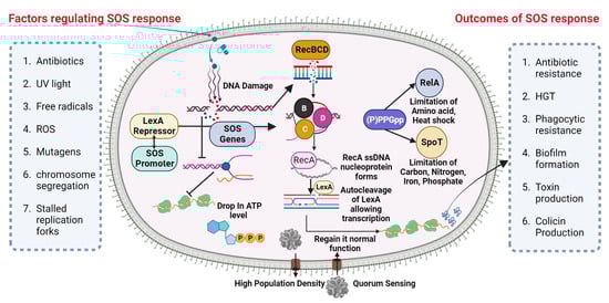 The cellular SOS response is a captivating bacterial defense mechanism through which bacteria can acquire drug resistance, induce mutagenesis, and undergo genome reorganization [69]. The Lexi promoter-binding repressor protein regulates the SOS system. Upon binding to the RecA filament, the LexA protein undergoes self-cleavage, resulting in a reduction in LexA protein levels within the cell. This process subsequently triggers the activation of over 40 genes in bacterial cells, including the recA gene [70]. The proteins associated with the SOS response play a crucial role in regulating various metabolic processes within bacterial cells [71]. Furthermore, mutagenesis is initiated during the advanced phases of the SOS response. The PolV polymerase has been identified as a key driver of SOS-dependent mutagenesis in Escherichia coli (E. coli) [72]. The polymerases known for their high error rates in DNA synthesis, which are notorious for their low accuracy, encompass PolV polymerase within their category. One of the causes of induced mutagenesis can be attributed to the activity of PolV, which leads to the insertion of an erroneous nucleotide into the DNA molecule. The formation of a RecA by PolV polymerase is expected to impose certain constraints on the potential diversity of recombinases during the process of selection [73]. The process of replicating damaged DNA, known as translesion synthesis (TLS), entails the utilization of PolV polymerase to bypass DNA lesions.