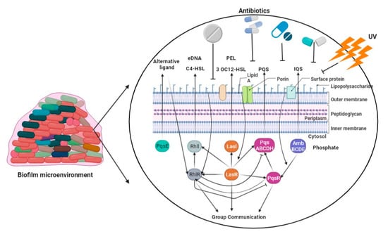 The sensitivity of pseudomonas cells cultivated in biofilms is comparatively lower to antimicrobial agents and host immune responses when compared to cells grown in free aqueous suspension [80]. When bacteria proliferate within a biofilm, even those lacking protective mutations or innate resistance mechanisms can exhibit a reduced susceptibility to antibiotics [81]. When bacteria experience a loss of biofilm protection, there is a rapid restoration of antibiotic sensitivity. This suggests that the resistance to antibiotics mediated by biofilms is not a result of genetic changes or an adaptive mechanism [82]. The overarching mechanisms underlying biofilm-mediated resistance involve impeding the penetration of antibiotics, creating a modified microenvironment that hinders the growth of biofilm cells, triggering an adaptive stress response, and promoting the differentiation of persister cells. These processes collectively serve to safeguard bacteria from the detrimental effects of antibiotic treatment [81].
