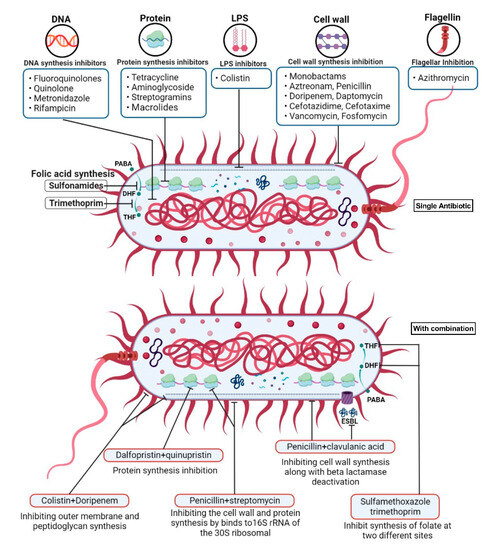Diagrammatic representation showing mechanisms of action of single antibiotics and antibiotic with combinations.
