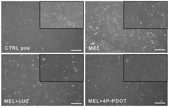 Unchanged morphology of ADSCs after a 48 h exposure to melatonin (MEL), melatonin with luzindole (MEL + LUZ), and melatonin with 4-P-PDOT (MEL + 4-P-PDOT), as compared to the untreated cells (CTRL). Scale bars—30 µm (magn. 40×; magn. in the miniature: 100×).