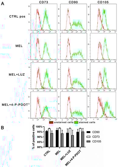 Expression of mesenchymal stem cell markers—CD73, CD90, and CD105—after a 48 h culture in the presence of melatonin (MEL), melatonin with luzindole (MEL + LUZ), melatonin with 4-P-PDOT (MEL + 4-P-PDOT), and in the control cells. (A) FACS histograms representative of CD73+, CD90+, and CD105+ ADSC cells. (B) Number of CD73+, CD90+, and CD105+ cells as a percentage of cultured ADSCs (ANOVA, post hoc Tukey, p < 0.05, mean ± SD, n = 3).