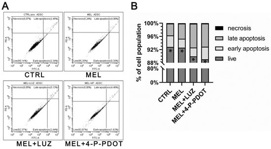 Detection of apoptotic or necrotic cells in cultures treated for 48 h with melatonin (MEL), melatonin with luzindole (MEL + LUZ), and melatonin with 4-P-PDOT (MEL + 4-P-PDOT). (A) FACS analyses representative of the experimental populations of ADSCs. (B) Mean percentage of live-, early-, or late-apoptotic and necrotic cells in cultured ADSC populations (* p < 0.05 as compared to necrotic and apoptotic cells, ANOVA, post hoc Tukey, p < 0.05, n = 3).