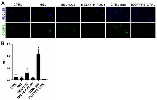 Immunodetection of cleaved caspase-3 in ADSCs treated for 48 h with melatonin (MEL), melatonin with luzindole (MEL + LUZ), and melatonin with 4-P-PDOT (MEL + 4-P-PDOT), compared to untreated cells (CTRL). (A) Polyclonal primary antibody (1:400) and secondary antibody conjugated with fluorochrome Alexa Fluor 488 (1:1000) were used for cleaved caspase-3 (Asp175) visualized with FITC (green). Cell nuclei were visualized with DAPI (blue). Apoptotic ADSCs cultured in 2% DMSO served as the positive control (CTRL pos). In experimental groups: scale bars—15 µm, magn. 100×. In isotype controls: scale bars—40 µm, magn. 40×. (B) Mean fluorescence intensity (MFI) measured with ImageJ software v. 1.52a (ANOVA, post hoc Tukey, * p < 0.05 vs. CTRL, mean ± SD, n = 3).