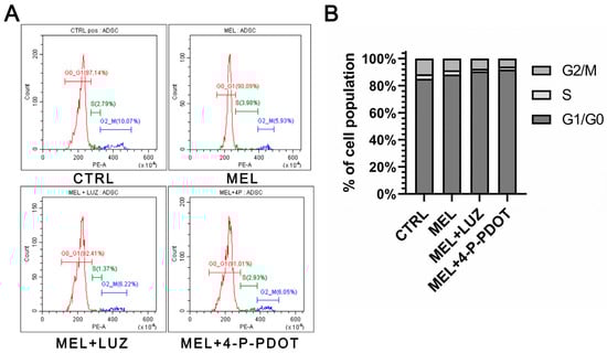 Flow cytometric analysis of cell cycle in ADSCs treated for 48 h with melatonin (MEL), melatonin with luzindole (MEL + LUZ), and melatonin with 4-P-PDOT (MEL + 4-P-PDOT), and in untreated (CTRL) cells. (A) FACS histograms representative of experimental populations of ADSCs in different phases of the cell cycle. (B) Mean percentage of ADSCs representing different phases of cell cycle in experimental cultures (ANOVA, post hoc Tukey, p < 0.05, n = 3).