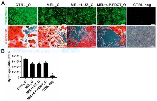 Effect of melatonin on hydroxyapatite and calcium deposition during ADSC differentiation. (A) The hydroxyapatite and calcium deposition secreted by ADSCs after 7 days of differentiation with melatonin (MEL_O), melatonin with luzindole (MEL + LUZ_O), and melatonin with 4-P-PDOT (MEL + 4-P-PDOT_O), as well as a culture of untreated, differentiated (CTRL_O), and undifferentiated ADSCs (CTRL neg). The process of extracellular calcium deposition was assessed using staining with Alizarin red solution (red color) and the identification of hydroxyapatite with an Osteoimage Kit (green fluorescence). (B) Relative fluorescence of hydroxyapatite in examined groups (means ± SD, * p < 0.05 vs. CTRL_O, ANOVA, post hoc Tukey, p < 0.05, means ± SD, n = 6). Scale bars—15 µm; magn. 100×.