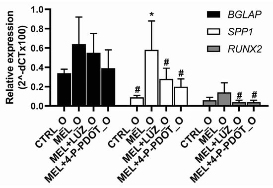 Expression of BGLAP, SPP1, and RUNX2 genes in ADSCs after 7-day differentiation with melatonin (MEL_O), melatonin with luzindole (MEL + LUZ_O), melatonin with 4-P-PDOT (MEL + 4-P-PDOT_O), and in untreated cells (CTRL_O) (ANOVA, post hoc Tukey, p < 0.05, means ± SD, n = 6, * p < 0.05 vs. CTRL_O, # p < 0.05 vs. MEL_O).
