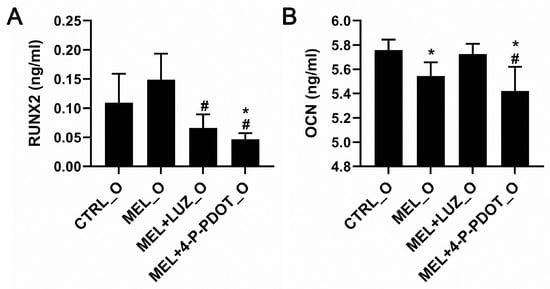 The concentrations of RUNX2 (A) and osteocalcin (B) in ADSCs after 7-day differentiation into osteoblasts. (A) * p < 0.05 vs. CTRL_O, # p < 0.05 vs. MEL_O, n = 6. (B) * p < 0.05 vs. CTRL_O; # p < 0.05 vs. MEL + LUZ_O, ANOVA, post hoc Tukey, p < 0.05, means ± SD, n = 6.