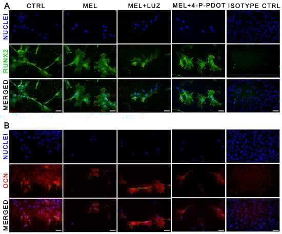Finally, the ability of ADSCs to differentiate into osteoblast-like cells after treatment with/without melatonin and its inhibitors was assessed. ADSCs were treated with MEL, MEL + LUZ, and MEL + 4-P-PDOT for 7 days and cultured in an osteogenic medium. After osteo-differentiation, cells were stained for the detection of calcium deposits and hydroxyapatite. Moreover, expression of the osteogenesis-related genes runt-related transcription factor 2 (RUNX2), bone gamma-carboxyglutamate protein (BGLAP), and secreted phosphoprotein 1 (SPP1) were analyzed with RT-qPCR, while the level of osteoblast-specific proteins RUNX2 and osteocalcin were analyzed with an enzyme-linked immunosorbent (ELISA) and immunofluorescence.