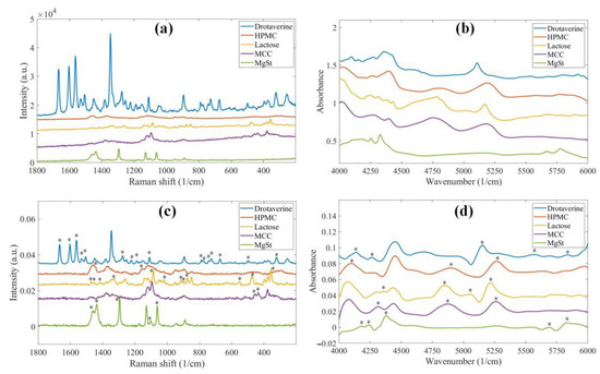 (a) Raw Raman spectra; (b) raw NIR spectra; (c) Raman spectra after preprocessing (smoothing, baseline correction and normalization); (d) NIR spectra after preprocessing (1st derivative) of the pure components of the sustained-release formulation. The asterisks mark peaks characteristic to the components after preprocessing.