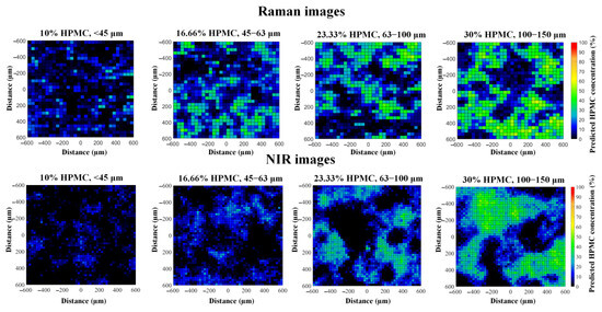 Raman and NIR images of the HPMC distribution of sustained-release tablets with various HPMC concentrations and particle sizes.