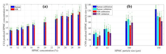 The capability of Raman and NIR imaging can also be quantitatively compared by evaluating the predictions of HPMC concentration and particle size (Figure 3). Generally, the CLS method tends to overestimate the concentration of compounds with a more intense signal and underestimate the other components. In this scenario, both spectroscopic techniques underestimated the concentration. To ensure better comparability of results, the difference between the averages of the real and predicted concentrations was added to the data before plotting (this difference was 6.85 for Raman and 14.72 for NIR). In Figure 3a, it is evident that the predictions of both Raman and NIR imaging follow the trend of increasing concentration, but NIR imaging does so with a higher standard deviation. As for the predictions of particle size by CNN (Figure 3b), they have a similar range, but NIR consistently predicts smaller sizes. It can also be observed that, in the case of the 100–150 µm fraction (the columns at 150 on Figure 3b), the validation samples are predicted with noticeably lower values with both techniques. Most likely there was not enough training data for the CNN to appropriately learn to quantify these larger particles. Consequently, the drug release rate from these tablets was later underestimated by the dissolution prediction model.