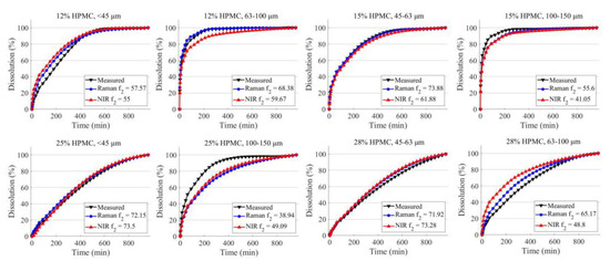 The final assessment of the two imaging techniques involves predicting the dissolution profile based on the HPMC concentration and particle size derived from the chemical maps (Figure 4). Both techniques managed to produce sufficient information for the ANNs, as the shape of the dissolution profiles closely resembles the measured dissolution in all cases. The average f2 is 62.7 for Raman and 57.8 for NIR. Predictions based on Raman imaging had an average root mean squared error (RMSE) value of 4.72 and a coefficient of determination (R2) value of 0.95, while NIR imaging yielded an RMSE of 6.44 and an R2 of 0.93. Raman imaging exhibited more accurate predictions in six out of the eight cases. However, the most significant deviations were observed in formulations with high HPMC concentration and a larger particle size fraction (25% HPMC 100–150 μm particle size and 28% HPMC 63–100 μm particle size). This less optimal performance could likely be attributed to the ANNs not having sufficient examples where high HPMC concentration is offset by the large particle size, thus hindering the ability to predict the dissolution rate accurately.