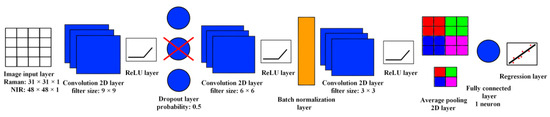Two types of information were extracted from these HPMC concentration maps. Firstly, the HPMC concentration of the tablet was characterized by averaging the HPMC concentration values for all the points of the map. Secondly, the particle size of HPMC was predicted using a CNN. The architecture of this CNN is shown in Figure 5.