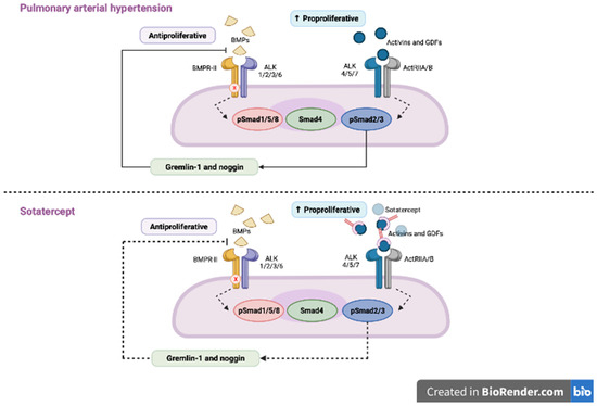 BMPR2 mutations, the transforming growth factor-β (TGF-β) superfamily, are crucial in heritable PAH and acquired PAH [49]. Thus, sotatercept a recombinant fusion protein consisting of the extracellular part of the human activin receptor type IIA, which is linked to the Fc piece of human IgG1 restores balance between growth-promoting and growth-inhibiting signaling. This fusion protein traps activins and growth differentiation factors (by reducing ACTRIIA-Smad2/3 signaling) involved in PAH [50]. The mechanism of action of sotatercept is presented in Figure 2. The STELLAR trial was a randomized double blind trial investigating sotatercept on top of double or triple PAH-specific therapy vs. placebo (n = 163 in the sotatercept group and n = 160 in the placebo group and among them 17.8% were patients with PAH-CTD). Sotatercept was administered by subcutaneous injections every 21 days in an initial dose of 0.3 mg/kg. The dose was increased to 0.7 mg/kg on the second visit. According to the results of this trial, patients in the sotatercept group had significantly improved exercise capacity and reduced risk of clinical worsening or death by 84% compared with placebo for a hazard ratio (HR) of 0.16 (95% CI, 0.08–0.35; p < 001). The most common adverse events of special interest were bleeding events (21.5%, mostly nonserious epistaxis and gingival bleeding), telangiectasia (10.4%) thrombocytopenia (6.1%), increased hemoglobin level (5.5%) and increased blood pressure (3.7%) [51]. Patients who completed the STELLAR trial can be enrolled into the ongoing SOTERIA trial (NCT04796337). The impressive results of the STELLAR trial provided promising data for novel therapeutic strategies for PAH. It might be a novel approach to the treatment of PAH in combination with already approved therapies.