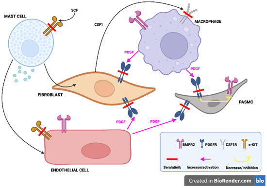 Seralutinib, by blocking the PDGF receptors located on the fibroblasts and pulmonary arterioles smooth muscle cells (PASMC), promotes the BMPR2 function, in addition, sotatercept, by inhibiting the c-KIT receptors located in the mast cells and endothelial cells as well as CSF-1 receptors located in the macrophages, favors the BMPR2 function and decreases inflammation. Adapted from Ref. [61].