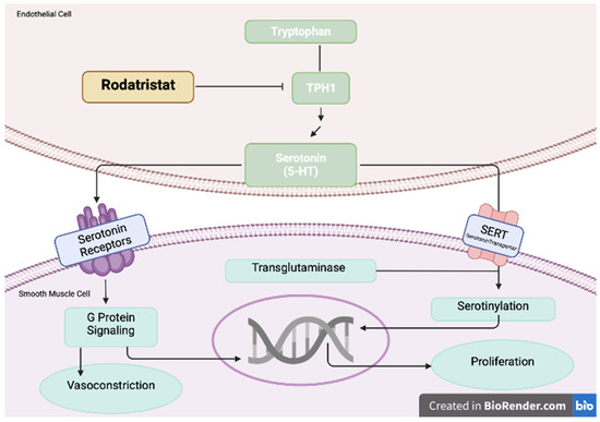 The ELEVATE 2 is a double-blind trial with rodatristat ethyl, which blocks the serotonin-producing enzyme tryptophan hydroxylase (TPH, NCT04712669). Increased levels of serotonin promote pulmonary arterial smooth muscle cell proliferation and contraction which is a hallmark of PAH development. Rodatristat ethyl is a first-in-class orally administered prodrug, which does not cross the blood–brain barrier and is able to exclusively reduce peripheral and lung serotonin. By decreasing the concentration of circulating serotonin, rodatristat ethyl is a promising novel agent in PAH treatment [62]. The mechanism of rodatristat ethyl, by inhibiting the serotonin pathway, is shown in Figure 4.