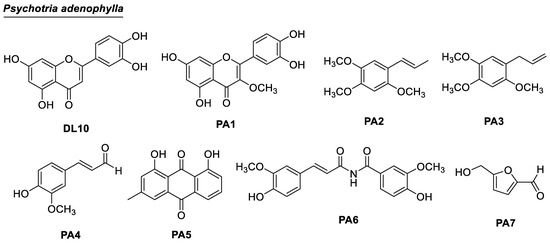 Chemical structures of compounds DL10 and PA1–PA7 from P. adenophylla.