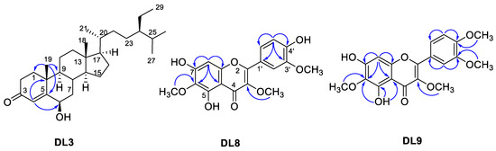 Thirteen compounds were isolated from D. linearis. They were structurally elucidated as β-sitosterol (DL1) [14], daucosterol (DL2) [15], 6-hydroxystigmast-4-en-3-one (DL3) [16], 2,2′,4,4′-tetra-tert-butylbenzophenone (DL4) [17], chakyunglupulin B (DL5) [18], daidzein (DL6) [19], genistein (DL7) [20], jaceidin (DL8) [21], bonanzin (DL9) [22], luteolin (DL10) [23], quercetin (DL11) [24], isoquercetin (DL12) [25], and kaempferol (DL13) [26]. The chemical structures of all Isolated compounds were determined using 1D and 2D NMR methods. For compound DL3, the position of 6-OH was defined using the Heteronuclear Multiple Bond Correlation (HMBC) of H-4 to C-6 (Figure 3). The configuration of C-6 was defined based on the small J value of H-6 [16]. The positions of the methoxy groups of multi-oxygenated flavonoids DL8 and DL9 were defined using HMBC correlations (Figure 3).