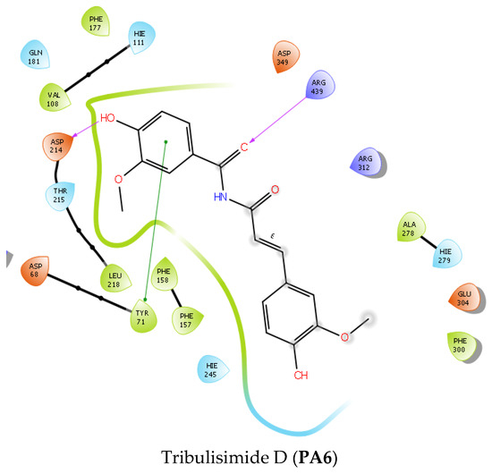 The EA extract and its derived fractions of P. adenophylla showed potent activities, with IC50 values ranging from 1.7 to 26.6 µg/mL, much lower than that of the crude MeOH extract (Table 1). However, the isolation of bioactive components from these extracts and fractions is limited due to their high lignin content. The detection of the mixture of undefined lignins was determined using NMR and HPLC methods (Figure S20.1–20.3). Such macromolecules were known to be potent alpha-glucosidase inhibitors [54]. Only three compounds, PA5–PA7, were isolated from the most active fraction, EA5, but these compounds do not reflect the activity of the starting fraction. These compounds showed moderate activity with IC50 values in the range of 76.2–249.7 µM. Tribulusimide D (PA6) was previously found in Euphorbia dracunculoides [55] and Tribuli fructus [32], showing significant hepatoprotective activity with an EC50 value of 13.46 µM.