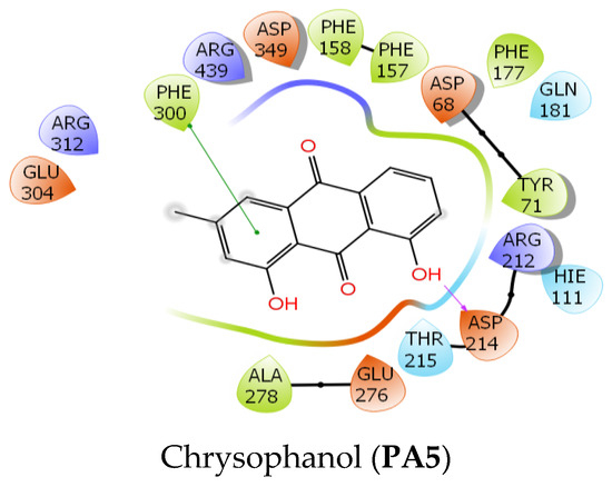 Chrysophanol (PA5). Yellow amorphous solid. 1H-NMR (500 MHz, methanol-d4, δ ppm, J in Hertz): 12.05 (1H, s, 8-OH), 11.95 (1H, s, 1-OH), 7.83 (1H, t, 8.0, H-6), 7.79 (1H, dd, 8.0, 1.0, H-5), 7.63 (1H, d, 1.0, H-4), 7.36 (1H, dd, 8.0, 1.0, H-7), 7.20 (1H, brs, H-2), 2.50 (3H, s, H-11). 13C-NMR (125 MHz, methanol-d4, δ ppm): 163.3 (C-1), 124.9 (C-2), 150.7 (C-3), 121.7 (C-4), 115.0 (C-4a), 120.3 (C-5), 138.3 (C-6), 125.2 (C-7), 163.7 (C-8), 116.7 (C-8a), 190.0 (C-9), 114.7 (C-9a), 182.4 (C-10), 134.8 (C-10a), and 20.1 (C-11). These data were consistent with those reported in the literature [31].