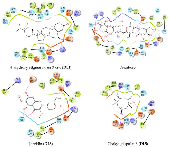 The 2D interactions of three ligand–protein complexes (DL3, DL5, and DL8) in comparison with acarbose.