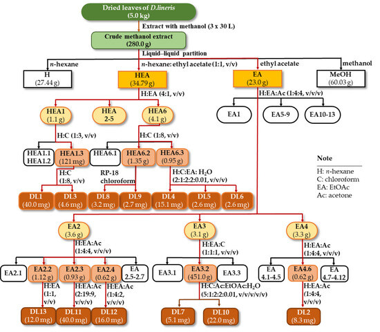 Isolation procedure of compounds DL1–DL13 from D. linearis.