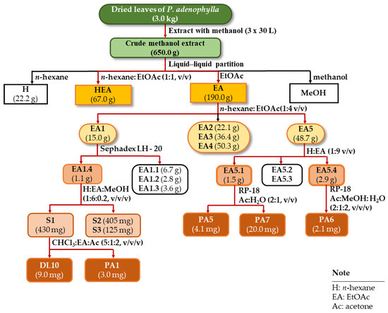 Isolation procedure of compounds DL10, PA1, and PA5-7 from P. adenophylla.