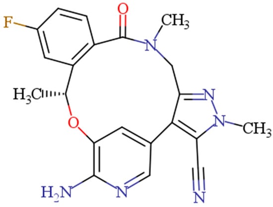 Lorlatinib (LOR, Figure 1) is the first ALK inhibitor of the third generation [,]. Due to the clinical effectiveness of LOR, the US-FDA awarded regular authorization to LOR for patients suffering from advanced metastatic ALK-positive NSCLC, in 2021 []. Additionally, the European Medicines Agency (EMA) has also authorized LOR for the same indications []. Tablets containing LOR are sold commercially under the brand name Lorbrena® (Pfizer Inc., New York, NY, USA). The suggested oral dose of LOR is 100 mg once a day [].