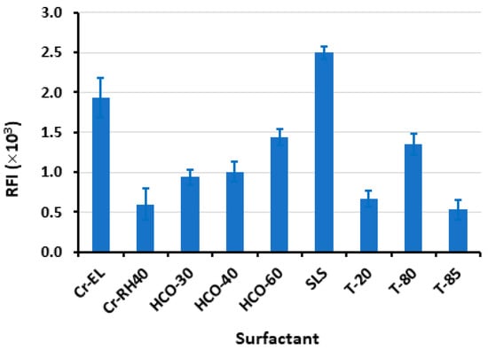 The impact of surfactant type on the relative fluorescence intensity (RFI) values of LOR was investigated by introducing 40 µL of an aqueous solution (1%, w/v) of each specific surfactant to the wells containing 100 µL of the LOR solution (400 ng mL−1). The surfactants employed in the study were Cremophor RH 40 (Cr RH-40); Cremophor EL (Cr-EL); polyoxyethylene hydrogenated castor oil 30, 40, and 60 (HCO -30, 40, and 60); Tween 20 (T-20), T-80, and T-85; and SLS.
