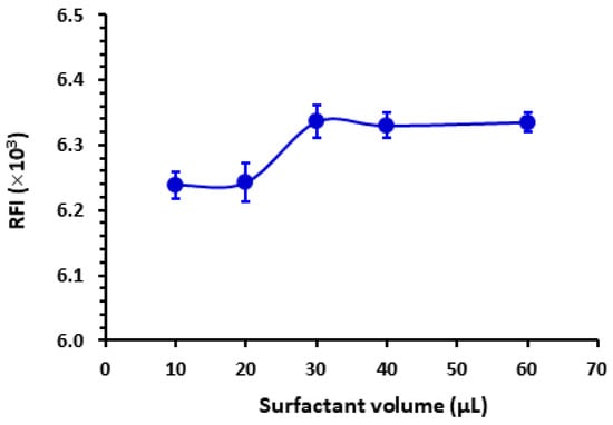 The results depicted in Figure 3 indicate that the SLS yielded the highest RFI. Various volumes (ranging from 10 to 60 µL) of an aqueous solution containing 1% w/v of SLS were introduced into the LOR standard solution. SLS is indeed an anionic surfactant carrying a negative charge when dissolved in water due to the sulfate group present in its structure. This anionic nature of SLS contributes to its surfactant properties, such as its ability to lower surface tension and form micelles in aqueous solutions. According to Figure 4, the maximal response was attained utilizing 30 µL of SLS. Beyond this volume, no further increase in RFI was observed. For reading with better precision, a volume of 40 µL was utilized subsequently in this study. It is wise to mention that this experiment was conducted using a relatively high LOR concentration (4000 ng mL−1) that permitted the detection of the weak signals obtained with some surfactants such as T-85.