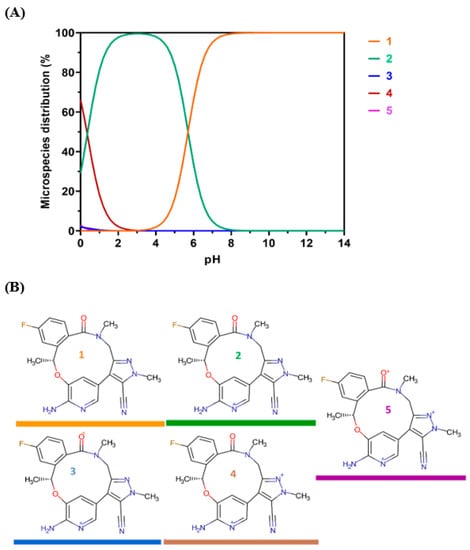 Theoretical protonation states of LOR as a function of the pH. (A): Microspecies distribution of LOR according to the pH value. The colors of the curves match with those of the chemical structures. (B): the chemical structures of the different protonated states of LOR.