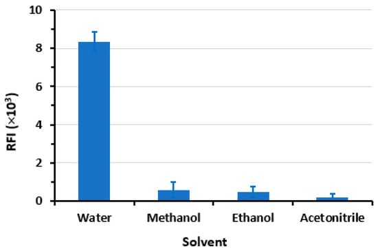 The findings of the study (Figure 7) indicate that water is the optimal solvent for dilution when SLS is present, as it yields the highest RFI and the lowest blank reading. Conversely, a noticeable and abrupt reduction in the RFI was observed in the micellar system when alternative solvents were employed. The observed phenomenon may be attributed to the denaturing impact of methanol and ethanol on the micelle that has formed. This can be attributed to the solubilization of these alcohols in water, which leads to a modification of the solvent properties, ultimately resulting in a reduction in the formation of micelles. Furthermore, the inclusion of these alcohols leads to a decrease in the dimensions of the micelles, yet with a gradual disintegration of the surfactant aggregate at exceedingly high concentrations [,,].