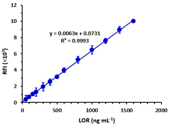 The generation of a calibration graph involved plotting RFI values on the y-axis against corresponding LOR concentrations on the x-axis, measured in ng mL−1. The resulting data were subjected to regression analysis [] using a weighting factor of 1. The results indicate that there exists a strong linear correlation (R2 = 0.9993) between the RFI values and LOR concentrations within the range of 60–1600 ng mL−1, as depicted in Figure 8. Table 1 presents the parameters utilized in the regression analysis. The determination of the limit of detection (LOD) and quantification (LOQ) was performed in accordance with the ICH Q2 (R1) guidelines []. LOD is defined as the lowest LOR concentration that can be detected by the proposed method. LOQ is defined as the lowest LOR concentration that can be quantified with acceptable accuracy and precision. The calculation of these parameters was carried out using the following formula: