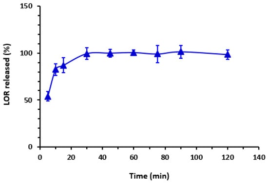 Impact of time on the dissolution of LOR tablets. Values are mean of 3 determinations ± SD.