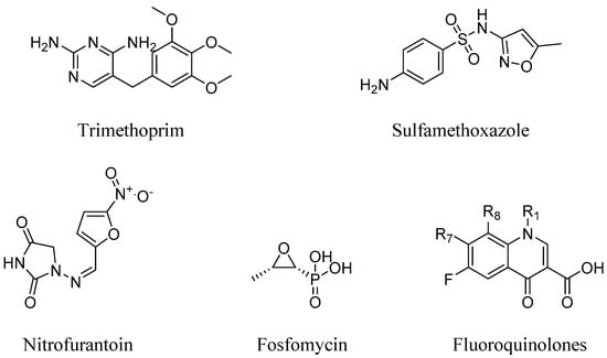 - Gupta, K.; Hooton, T.M.; Naber, K.G.; Wullt, B.; Colgan, R.; Miller, L.G.; Moran, G.J.; Nicolle, L.E.; Raz, R.; Schaeffer, A.J.; et al. International Clinical Practice Guidelines for the Treatment of Acute Uncomplicated Cystitis and Pyelonephritis in Women: A 2010 Update by the Infectious Diseases Society of America and the European Society for Microbiology and Infectious Diseases. Clin. Infect. Dis. 2011, 52, e103–e120. [Google Scholar] [CrossRef]