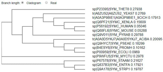 The P. mirabilis MetRS amino acid sequence was obtained from the ExPASy proteomics server at the Swiss Bioinformatics Institute [23]. The sequence of the enzyme has the Uniprot identifier B4ESY6 (SYM_PROMH) and is formed of 675 residues [71]. A homology search was performed using SIB BLAST service [22,72] accessible through the ExPASy server, which was used to align the P. mirabilis MetRS amino acid sequence against the sequences of the 3D-resolved structures in the protein data bank [73] to identify the best homologous proteins. The alignment parameters and the thresholds, which were used for screening expected homologues, were used with their default values and BLOSUM62 comparison matrix. The detailed parameters were described as the following: BLOSUM62 comparison matrix is utilized for protein with amino acids more than 85. E-expectation value threshold (E-value) is 10. The phylogeny server [25] was used to construct a phylogenetic tree for the target protein along with the possible predicted homologous proteins and other selected MetRS enzymes from diverse organisms.