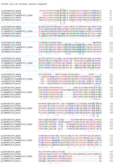 Clustal Omega 1.2.4 [26] was used to align the possible template sequences: E. coli (P00959), A. baumannii (A0A0D5YKJ7), P. abyssi (Q9V011), and A. aeolicus (O67298) MetRSs with the amino acid sequence of P. mirabilis MetRS (Figure 3). The input set of query and template sequences have an evolutionary relationship as they are Gram-negative bacteria. No gap was observed in alignment between the P. mirabilis and E. coli MetRS sequence and there were very few gaps in the sequence alignment of P. mirabilis, P. abyssi and A. baumannii MetRS. This result is consistent with the distinction between the two groups that is explained by the constructed phylogenetic tree. HIGH and KMSKS motifs are recognized in the proposed sequences of the possible templates and the query enzyme, indicated by the boxed amino acid residues in Figure 3.