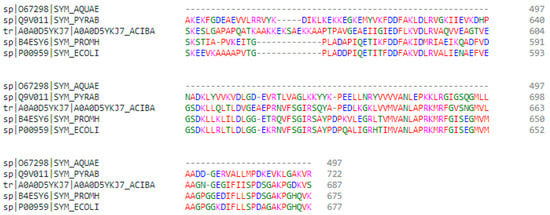Sequence alignment of MetRS enzymes of Aquifex aeolicus, Pyrococcus abyssi, Acinetobacter baumannii, Proteus mirabilus and Escherichia coli using Clustal O in which “*” means that the residues are identical, “:” means that conserved substitutions have been observed, “.” means that semi-conserved substitutions are observed. The residues are colored according to their chemical properties where red, small hydrophobic (AVFPMILWY); blue, acidic (DE); purple, basic (RHK); green, hydroxyl + amine + basic (STYHCNGQ).