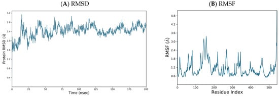 (A) RMSD and (B) RMSF plots for P. mirabilis MetRS over 200 ns molecular dynamics simulation.