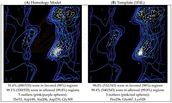 Ramachandran analysis using MolProbity [31] of the P. mirabilis MetRS homology model and the E. coli MetRS template (pdb 1F4L [32]) indicated that 99.1% (530/535) of amino acid residues of the homology model were in the allowed regions compared with 99.4% (540/543) in the template with five and three amino acids identified as outliers, respectively (Figure 6; Supplementary Figures S4 and S5).