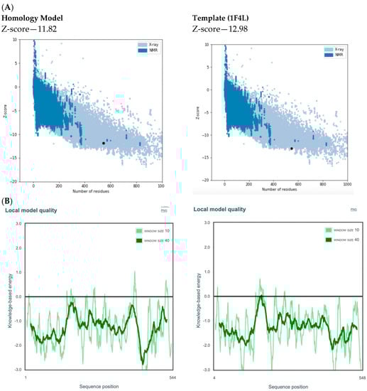 The homology model performed well compared with the template 1F4L in the ProSA (protein structure analysis) evaluation [33] with a z-score of −11.82 compared with the template which had a z-score of −12.98 (Figure 7A). The local model quality plot of the homology morel shows no positive values, which would correspond with problematic or erroneous parts of the input structure, suggesting a good quality model (Figure 7B).
