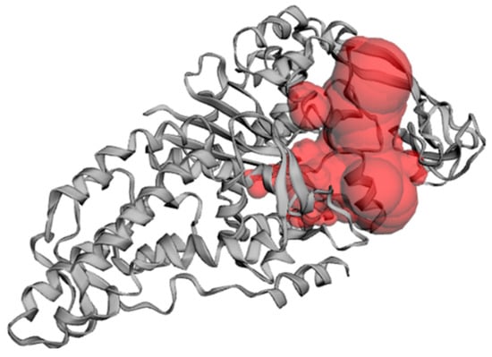 Cartoon representation of the binding site topology of the homology model. Putative pocket; red color, was calculated via the CASTP server of proteins.