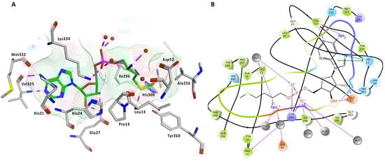 Pharmacophore-based virtual screening: (A) 3D pharmacophore with ten features; (B) the most promising compound fitting with the pharmacophoric features in the active site of the model.