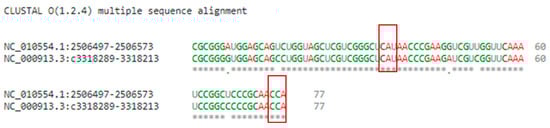 Genomic alignment of tRNAmet for P. mirabilis and E. coli, respectively, where boxed nucleotides are the conserved CAU anticodon and CCA end. “*” indicates identical nucleotide.