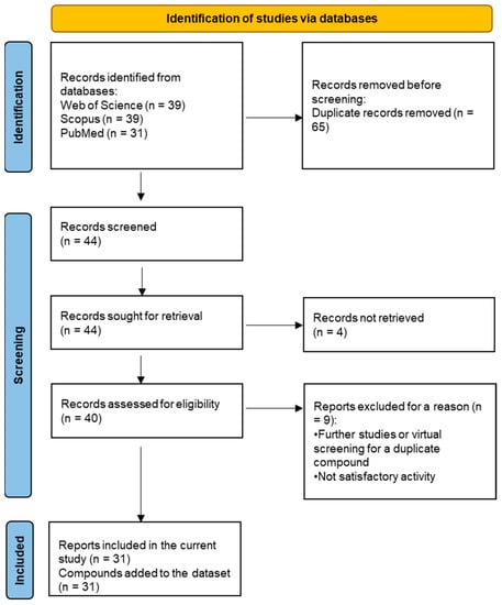 A systematic database search was used to select active compounds against MetRS in a variety of organisms to prepare a dataset of compounds for P. mirabilis MetRS screening. The selection process followed the PRISMA flowchart [39], as summarized in Figure 14.