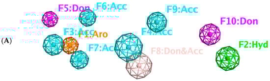 The system was prepared using the default settings for MOE [28], specifically the Amber10:EHT forcefield, solvation R-filed, and Receptor strength 5000. The docking poses for the ligands were loaded and superimposed with common features selected from the consensus to form the pharmacophore features (Figure 15A). Relevant features were selected. The search allowed for a partial match with a minimum of three or four features with best match determined from the rscore value (the sum of the individual feature (F1–F10) rscores) and visual inspection of fit and binding in the active site.