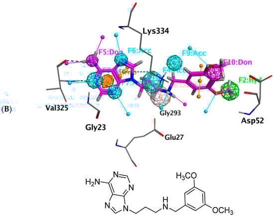 Three compounds of the prepared library are inhibitors for E. coli MetRS [54,55,56,63,64]. These compounds along with the natural substrate were used to prepare a 3D pharmacophore model within MOE [28]. A ten-feature model was generated (Figure 15A) and used to screen the created library. Initial screening with minimum three features resulted in 29 of the 31 compounds passing the pharmacophoric filter. Further analysis with minimum four features matched, and a visual inspection of the binding resulted in the choice of one compound as the most promising inhibitor (Figure 15B) [67]. This compound was able to match most of the features represented by having an aromatic center (F1), hydrophobic centroid (F2), several hydrogen bond donor and acceptor features (F3, F5, F6 and F7), and very close to the donor feature (F10). All these features made the compound able to fit perfectly in the pocket-forming interactions with some of the key amino acid residues (Val325, Lys334, and Leu13) to anchor the ligand.