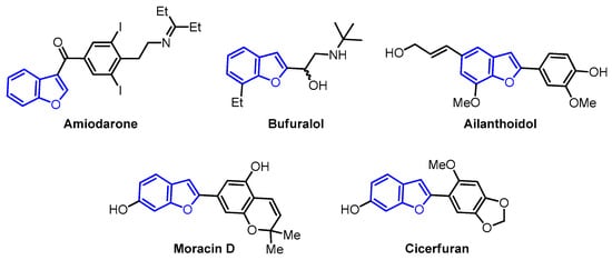 In this context, oxygen-containing heterocycles stand out due to their broad spectrum of biological and pharmacological activities. Their significance stems from their structural similarities with a variety of well-established natural and synthetic compounds []. The inherent importance of oxygen-containing heterocycles as therapeutic agents resides in their distinctive structural characteristics, closely resembling those present in biologically active compounds, like ribose derivatives [,]. In these compounds, the prevalence presence of oxygen atoms contributes to polar interactions that foster stabilization within the active site [,]. Among these compounds, the benzo[b]furan scaffold, positioned within the domain of oxa-heterocycles has recently garnered significant attention. Its distinct physiological and chemotherapeutic properties are accentuated, further accompanied by its widespread prevalence in the natural realm. Some of the most prominent benzo[b]furan derivatives exhibit remarkable pharmaceutical applications, such as Amiodarone, used to treat life-threatening ventricular arrhythmias [], and Bufuralol, employed as a nonselective β-adrenoceptor antagonist, which can lead to potential complications like hepatic toxicity or adverse drug interactions (Figure 1) []. Recent studies have shown that Ailanthoidol exhibits antitumor potential by suppressing TGF-β1-promoted HepG2 hepatoblastoma cell progression []. On the other hand, benzo[b]furan derivatives are widely distributed in various plant families, including Asteraceae, Fabaceae, and Moraceae [,]. For instance, Moracin D, isolated from Morus alba, exhibited anti-inflammatory and antioxidant activities, as well as induced apoptotic effects in prostate and breast cancer cells (Figure 1) [,]. Furthermore, Cicerfuran, isolated from the roots of chickpea (Cicer spp.), demonstrated antibacterial and antifungal activities []. The myriad applications in medicinal chemistry, biomedical science, and drug discovery have spurred both academia and the pharmaceutical industry to develop novel, efficient, and straightforward synthetic protocols for preparing a wide array of structurally diverse benzo[b]furan derivatives [,,,,,].